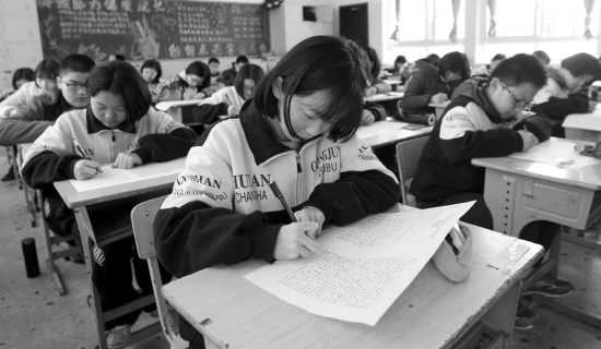3月26日,師大附中博才實(shí)驗(yàn)中學(xué)(北校),參加“尋找中國(guó)少年寫(xiě)作之星”2017創(chuàng)文大賽長(zhǎng)沙賽區(qū)決賽的學(xué)生在進(jìn)行筆試。圖/記者金林