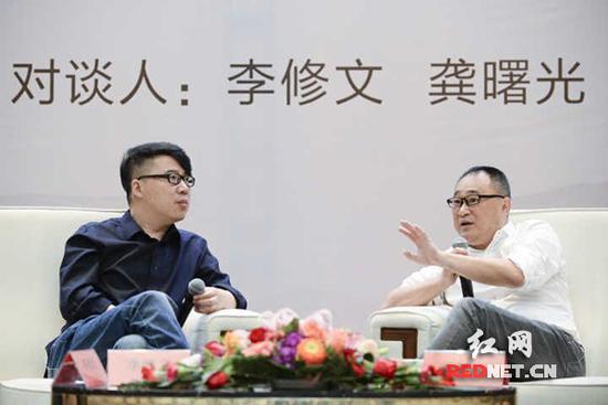 5月31日,河北廊坊,作家、影視劇編劇、監(jiān)制李修文(左)和湖南出版投資控股集團(tuán)黨委書記、董事長,中南傳媒董事長龔曙光(右)進(jìn)行題為“人民山河文辭袈裟”的文學(xué)對談。攝影/辜鵬博